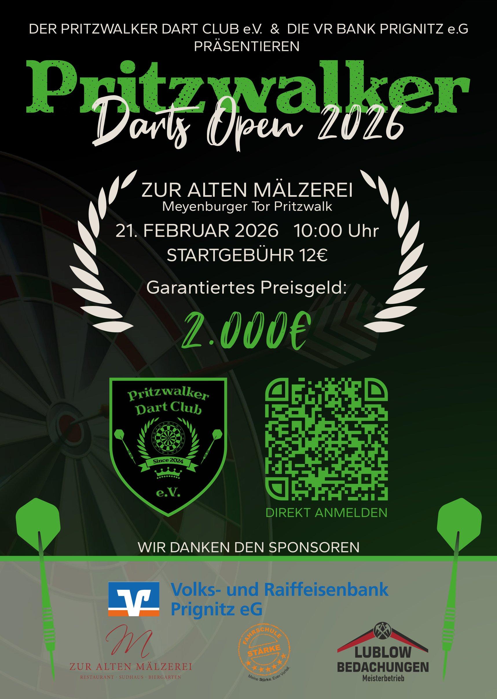 Am 21. Februar 2026 richtet der Pritzwalker Dart Club erstmals die Pritzwalker Darts Open im Sudhaus der Alten Mälzerei in Pritzwalk aus – ein Turnier, das in dieser Größenordnung ein Novum für die gesamte Prignitz, Ostprignitz-Ruppin und das Land Brandenburg darstellt. Mit 160 angemeldeten Spielerinnen und Spielern erreicht das Event eine Dimension, die weit über die regionale Darts-Szene hinaus Aufmerksamkeit erzeugt. Die Veranstaltung zieht Teilnehmende aus allen angrenzenden Bundesländern, darunter Berlin, Mecklenburg-Vorpommern, Sachsen-Anhalt, Niedersachsen sowie sogar Hamburg, an. Damit wird Pritzwalk für einen Tag zum überregionalen Treffpunkt des Dartsports.